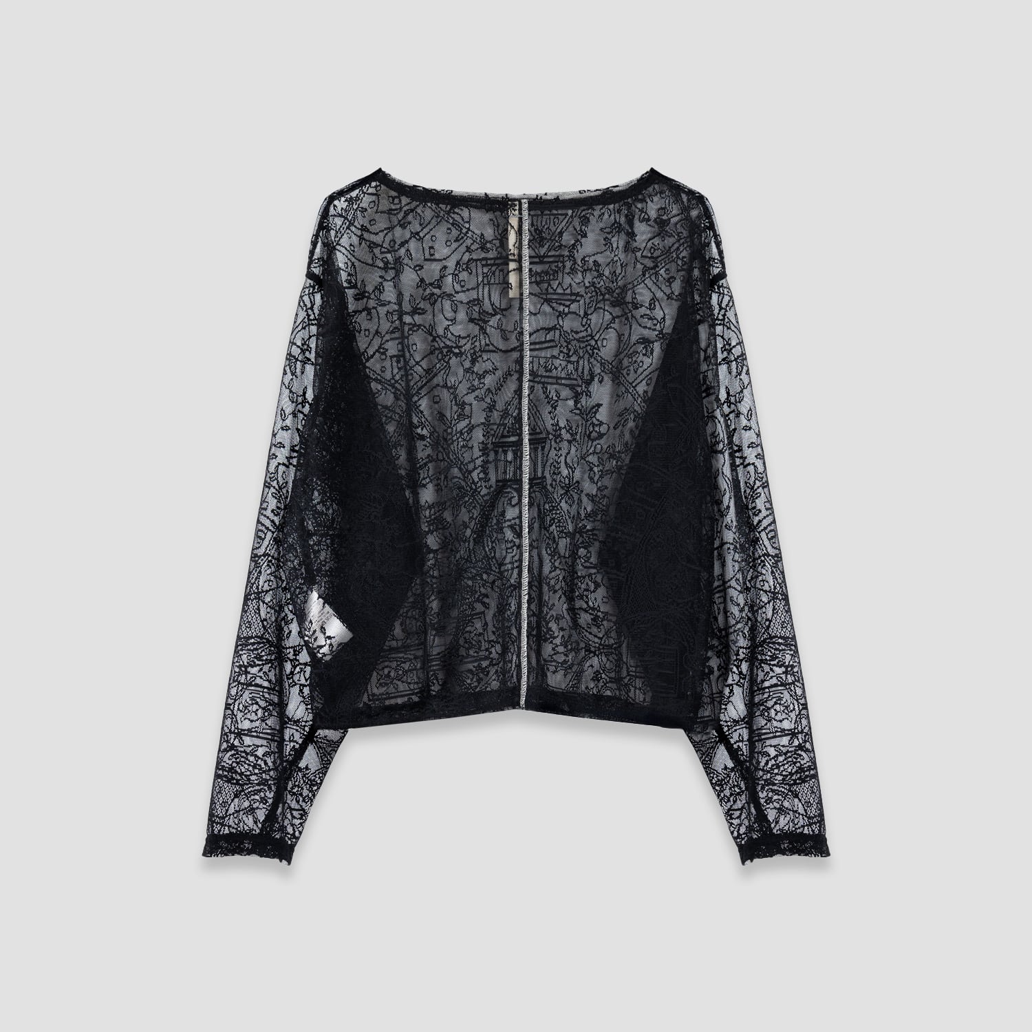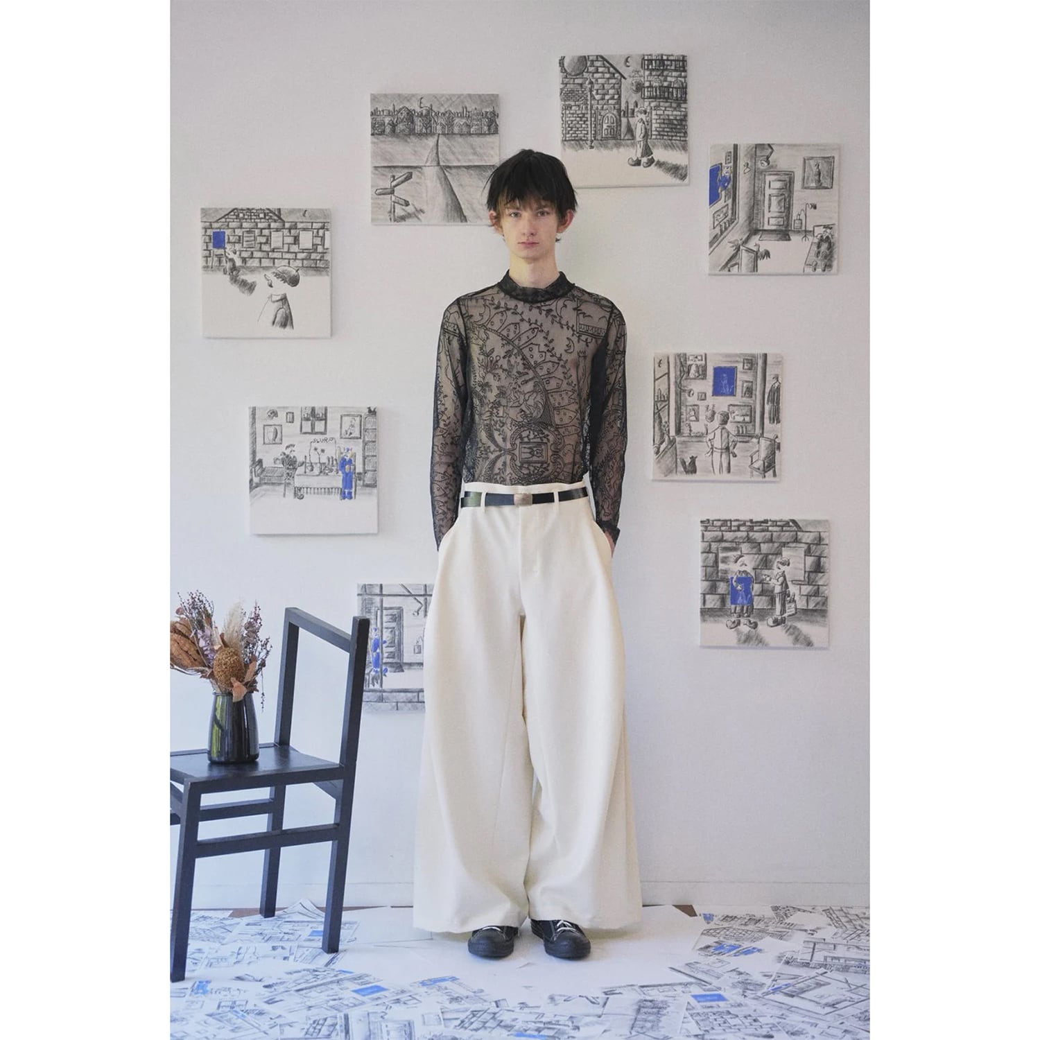 デザイナー 小塚氏が描いたアートワークをレース刺繍で表現したバスクシャツ。軽やかで華やかさがありながらも、どこか落ち着いたシックな雰囲気が魅力です。上品な透け感とリラックスしたシルエットで、インナーとのレイヤードも幅広く楽しめます。